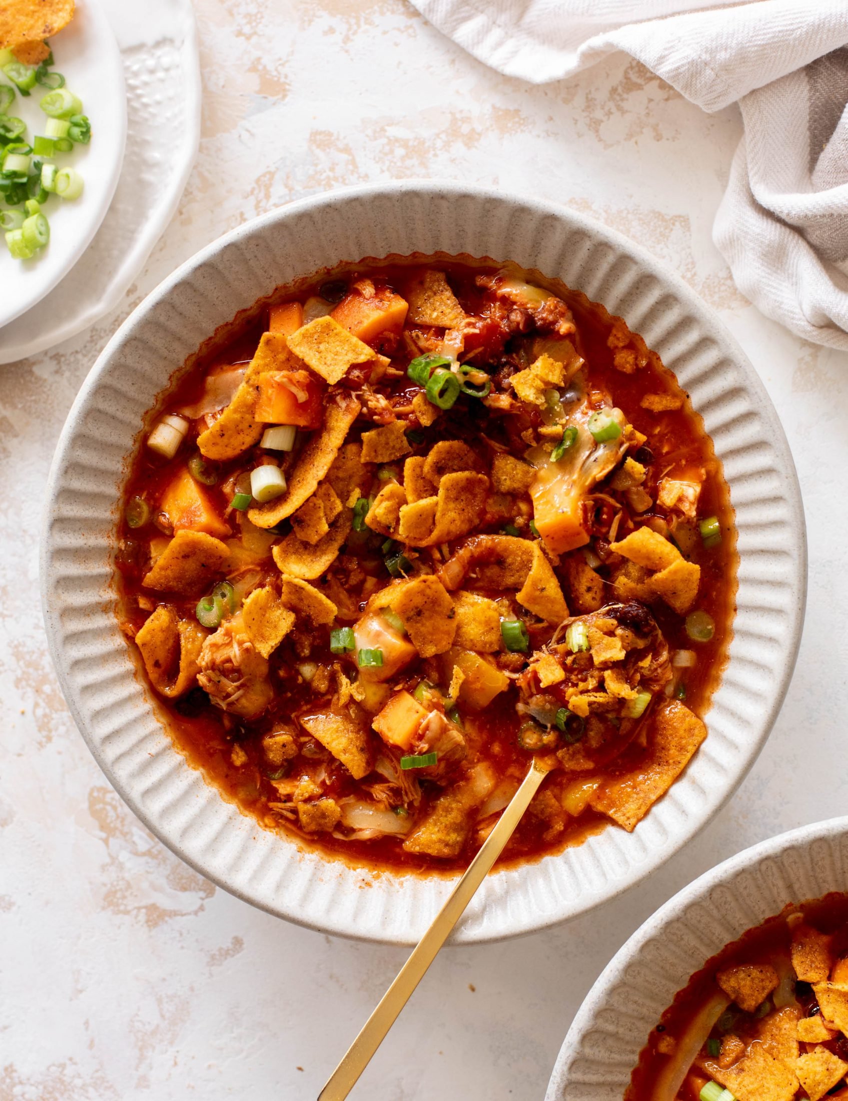 This sweet potato chicken chili is packed with flavor, tastes amazing and is super satisfying. It’s a meal I love to make ahead of time and it freezes great! It’s also such a cozy dinner and you can load it up with all the toppings.