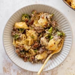 Me me! This baked broccoli sausage tortellini is so satisfying and delicious. It comes together in a pinch and is an amazing weeknight meal that the whole family will love.