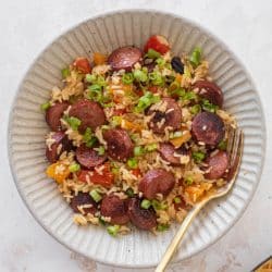 This one pot smoked sausage and rice is super simple and tastes amazing! This dish cooks quickly, uses smoked turkey sausage and fragrant jasmine rice. It’s so satisfying and a great meal to prep for lunch too.