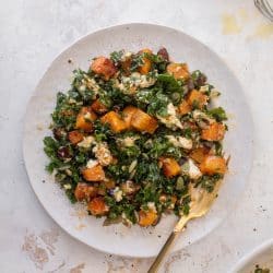I adore this butternut squash chopped salad! Kale, roasted, caramely buttery squash is served with creamy goat cheese, crunchy pepitas, dates and a delicious salted maple vinaigrette. It’s lovely to eat on a fall day!