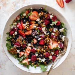 I LOVE salads just like this. I’ve shared a triple berry crunch salad before that has roasted chickpeas. And in Easy Everyday, I have another really delish berry arugula salad! The combination of the peppery arugula against the sweet berries is perfect and one we adore.