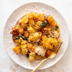 Baked Butternut Squash, Sausage and Spinach Pasta.