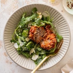 - Top the salad with your (warm or cold) meatballs (whole or chopped!) and sprinkle with the finely grated parm. Serve!